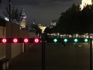 また、そんなにたくさんの人出なのに最寄りの地下鉄駅からスムーズに歩けると思ったら、大勢の警察官がいて交通整理をし、道路の両サイドを一方通行にしているのです。それに気づかず横断歩道を渡ろうとしたら、警察官に止められてしまいました。川沿いに上がる階段までもライティングをした標識を設置するほどの徹底ぶりです。