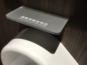 また、新しく改装されたばかりのショッピングモールのトイレの個室には「小物置き」が設置されています。しかし、明らかに「スマホ置き」です。