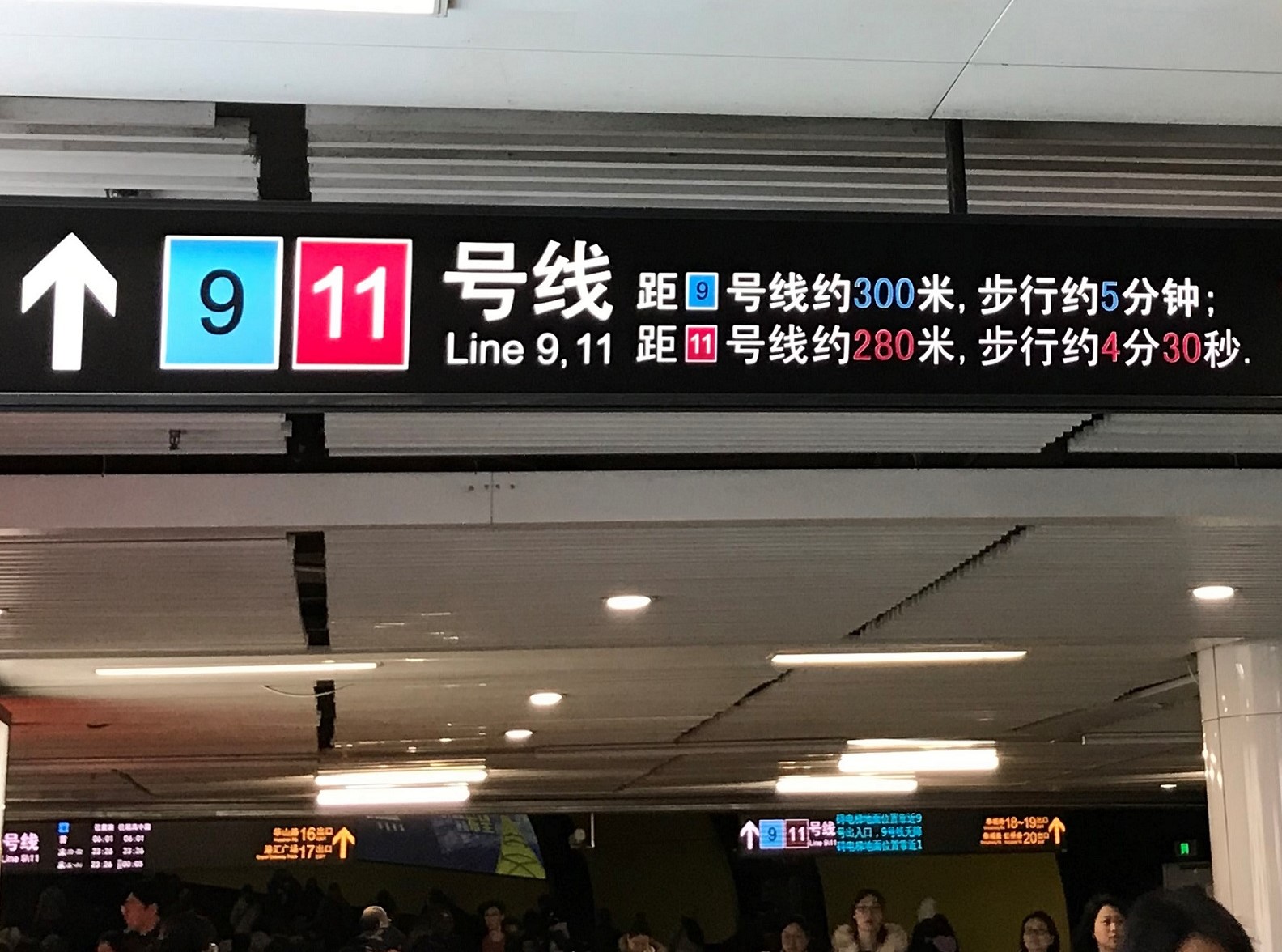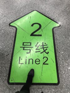 大阪は最近やっと駅の床に行き先案内が表示されるようになりました。しかし、上海では10年以上前から表示がされています。しかも日本のは細くて小さくて近づかないと見えませんが、上海のは大きくて遠くからでも一目瞭然です。(踏み出している私の足と比較して大きさをご想像ください)。